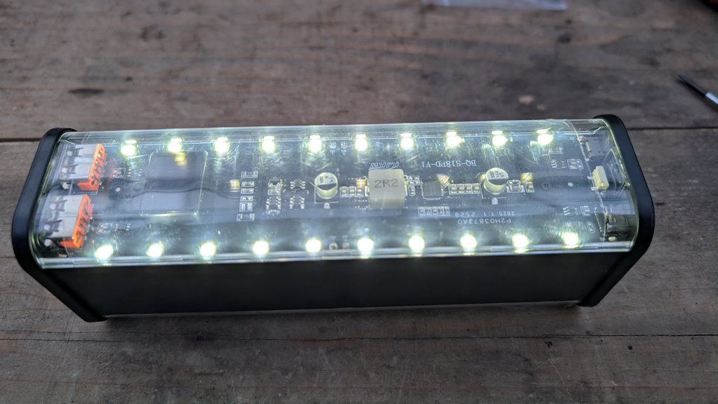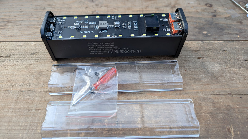 18650バッテリーが8個入るので、3.7V x 2000mA x 8本で、59200mW/h(59W/h)、5V換算で11,840mA 効率85%だと、10,064mAとなります。こんだけ大きくてたったの、10,064mAってどうなのよ?って言ったって、実際そんな物です。